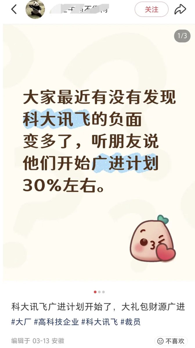 网友投稿:曝某AI技术大厂 科大讯飞 即将大裁员,规模达到1500人,但赔偿只给0.6N 最近几天,网传科大讯飞即将进行大裁员,规模达到1500人。 裁员在这年头已经不是什么稀罕事了,但问题是据说只给0.6N。 如果要N+1也会给,但之后会被公司方面封杀。 已经有一些网友带着工卡现身说法了。也有一些网友在评论区证实了该消息。