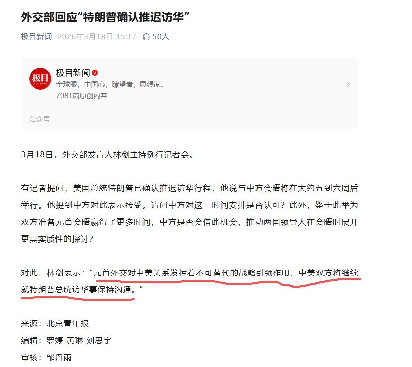3月18日,外交部回应“特朗普确认推迟访华”: 元首外交对中美关系发挥着不可替代的战略引领作用,中美双方将继续就特朗普总统访华保持沟通