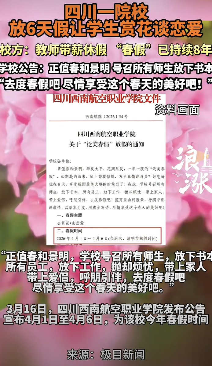 为了促生,四川西南航空职业学院给学生放假六天,鼓励他们趁着春天谈恋爱。