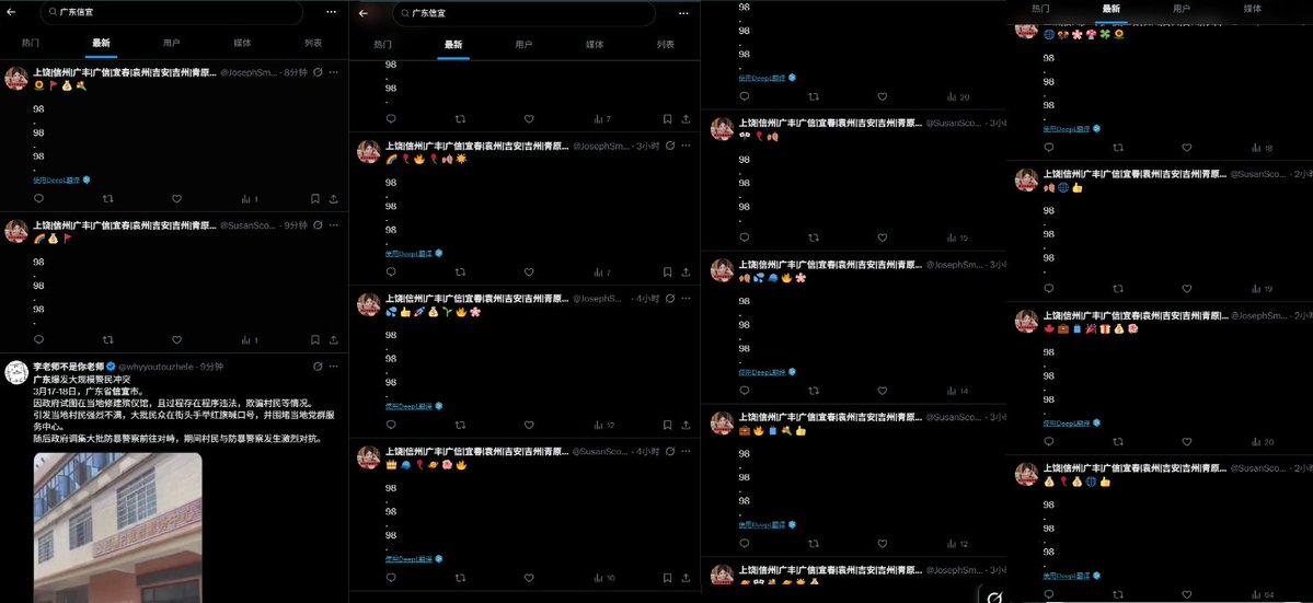约4个小时前开始,中国的水军机器人开始高频率密集污染X上的“广东信宜”搜索结果。垃圾信息从一天几条爆发到几分钟一条。