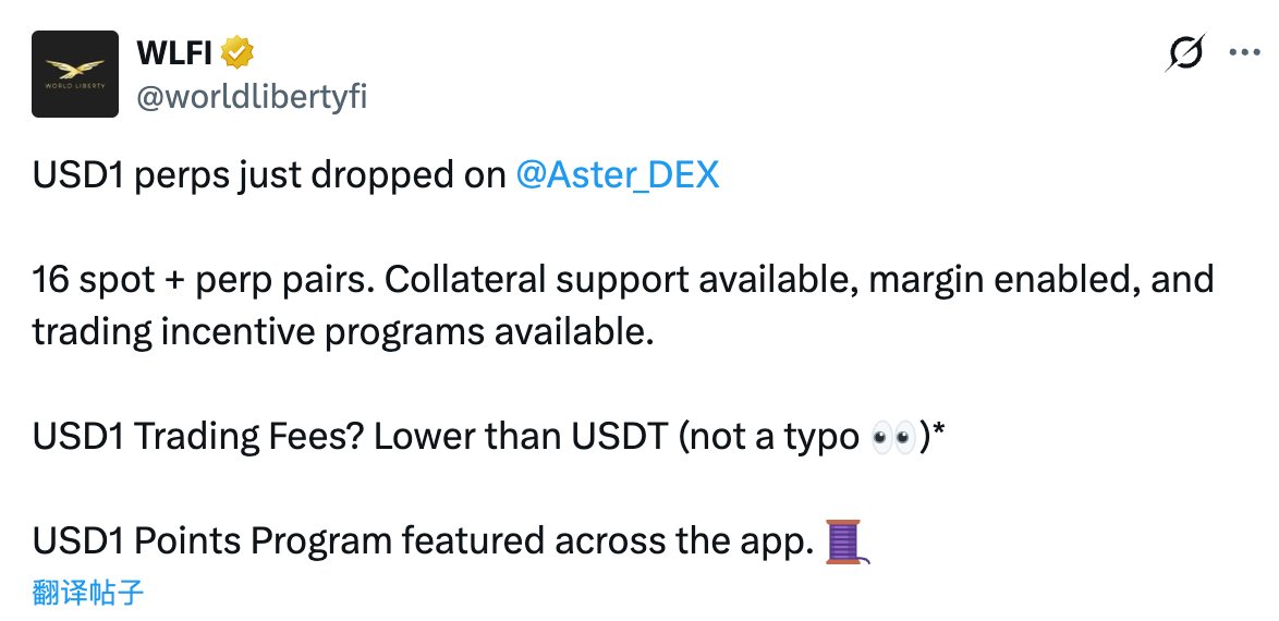Aster Chain 的首个合作伙伴:USD1🦅 BSC 生态的老朋友了属于是,不意外;除了 USD1 可作为保证金 / 抵押品外,活动还包括 ▶︎ 针对 USD1 交易对发放激励,每月 250 万枚 WLFI ▶︎ 既币安之后,在 Aster 持有 USD1 也有持仓奖励 ▶︎ Taker 手续费 0.5 bps,maker 则为 0 bps 很老钱,没别的,就是撒币…