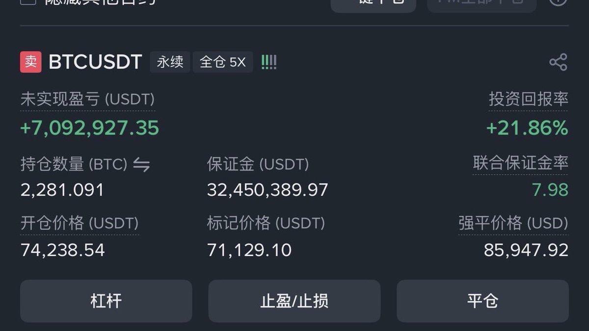 「先定 10 个大目标」老哥 在昨晚大盘下跌时平掉了空单,开仓价 $74238.54,平仓价 $71129.1,单笔交易获利 709.3 万美元,在此之前的多单赚了 1,466.8 万美元