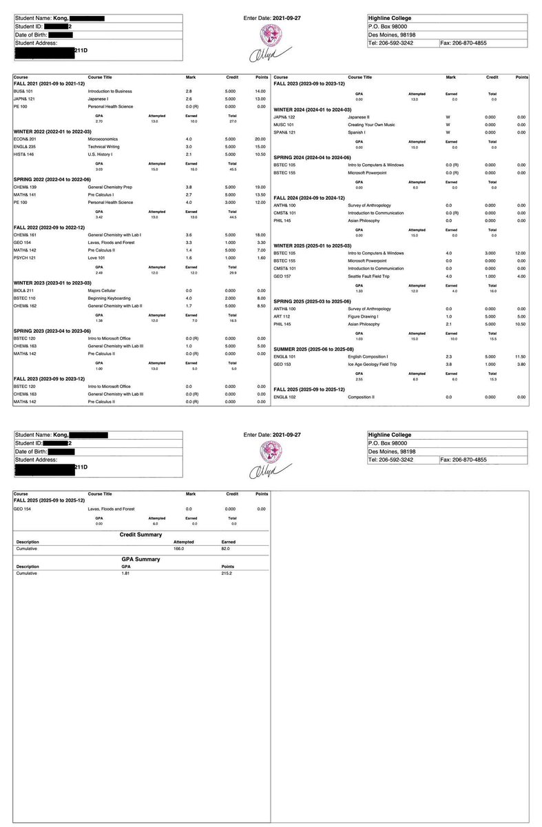 牢A在绿河学院(西雅图的社区大学)的成绩单