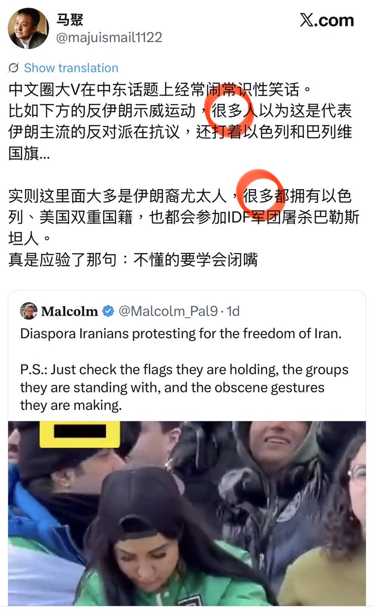 “马聚在中东问题上的观点和看法你不服不行,就算你不喜欢,但中东很多的事情就是在按马聚的预言在发展。这一切都是基于马聚在中东生活多年。我没有看到过马聚有任何支持恐怖主义的推文,标签全是你们XX贴的。”我完全同意您这里说的每句话,除了“支人”两个字。 我有一次到法拉盛的穆斯林难民中心聚餐,席间有几个青年难友言辞激愤、充满暴力,马聚听不下去,站起来正告他们:“我此生最大的责任,就是成为你们这些充满仇恨和暴力的穆斯林败类的敌人……”大意如此。