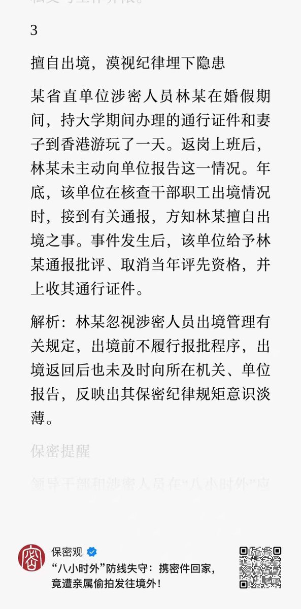 3月19日,有媒体报道:中国大陆一名涉密人员,婚假出境到香港游玩一天但没报备,结果被取消当年的评先资格,并上收其同行证件。