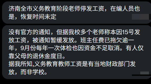 济南全市义务教育阶段的老师和在编人员面临停发工资的情况