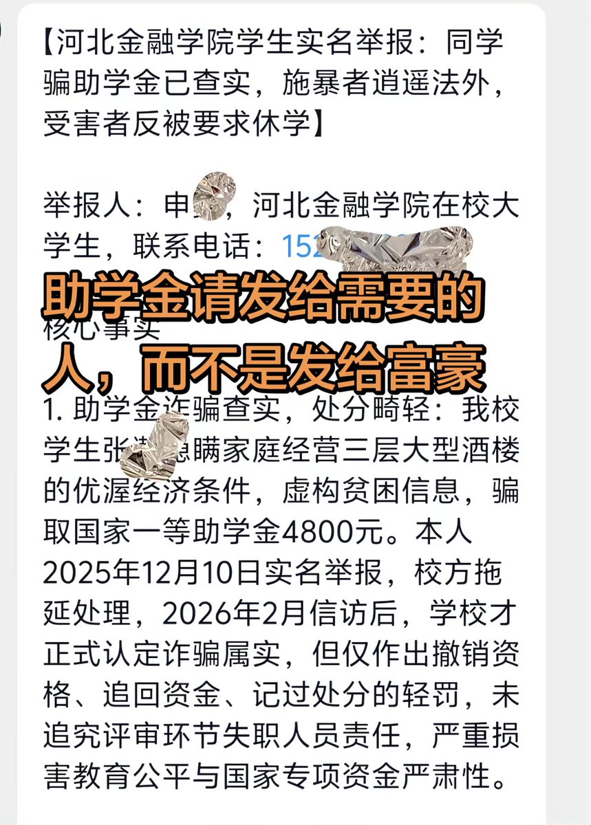 河北金融学院学生举报富二代同学骗取助学金,自己反遭学校休学 3月21日,一名网友称,他举报河北金融学院一名张姓学生,隐瞒家里经营三层大酒店的优渥条件,虚构贫困信息,骗取国家一等助学金4800元。但学校不处理。 今年2月,自己去信访后,学校才证实认定诈骗属实,但仅作出撤销资格、追回资金、记过处分的轻罚,未追究评审环节失职人员责任。 如今诈骗奖学金的学生逍遥法外,而自己却被学校要求休学。
