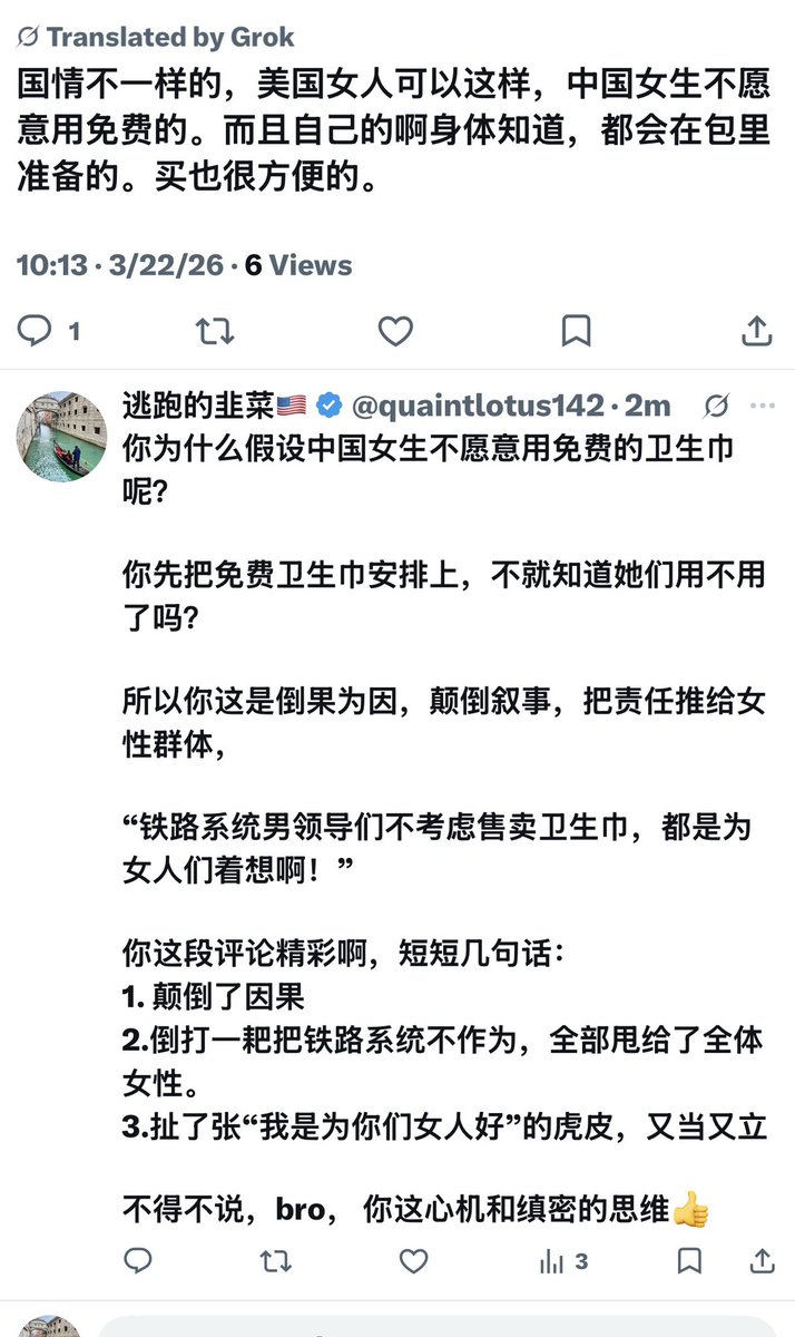 活到老,学到老。兄弟,好心机好手段啊!👍一箭双雕形容你都不够看。你这段评论最“精彩”的地方在于:1.通过假设受害者的偏好,来掩盖公共服务的缺失。2.扯一张“我是为你们女人好”的虎皮,把对女性需求的漠视美化成“体贴”。3.倒打一耙,将系统性的缺失归结为个体的习惯。