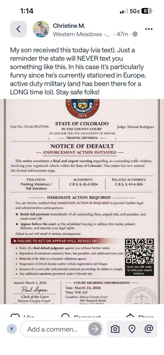 我有几个朋友今天收到这个诈骗信息,说你停车违规了,让你scan这个二维码付钱,千万不要上当!