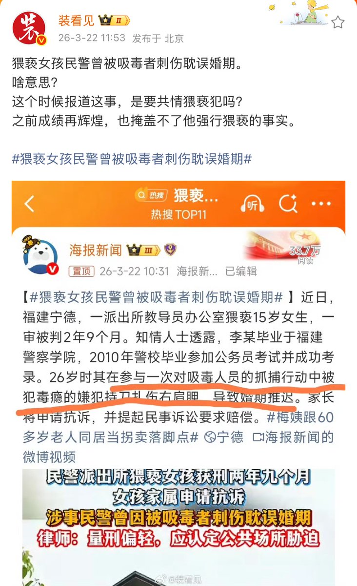 “猥亵女孩民警曾被吸毒者刺伤耽误婚期”啥意思?这个时候报道这事,是要共情猥亵犯吗?之前成绩再辉煌,也掩盖不了他强行猥亵的事实。”