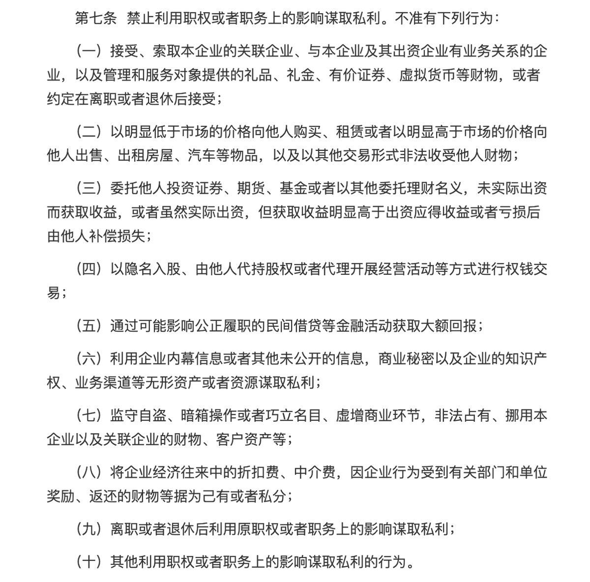中共中央印发《国有企业领导人员廉洁从业规定》,其中第七条明确禁止国有企业领导人员利用职权或职务影响谋取私利,具体包括: