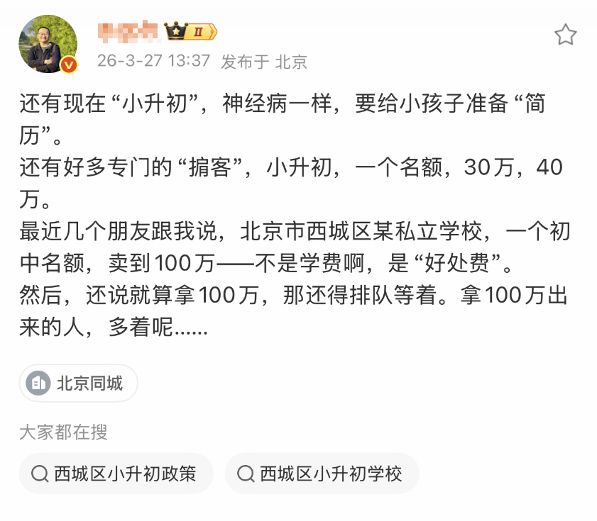 3月27日,国内记者发文:还有现在“小升初”,神经病一样,要给小孩子准备“简历”。还有好多专门的“掮客”,小升初,一个名额,30万,40万。最近几个朋友跟我说,北京市西城区某私立学校,一个初中名额,卖到100万——不是学费啊,是“好处费”。