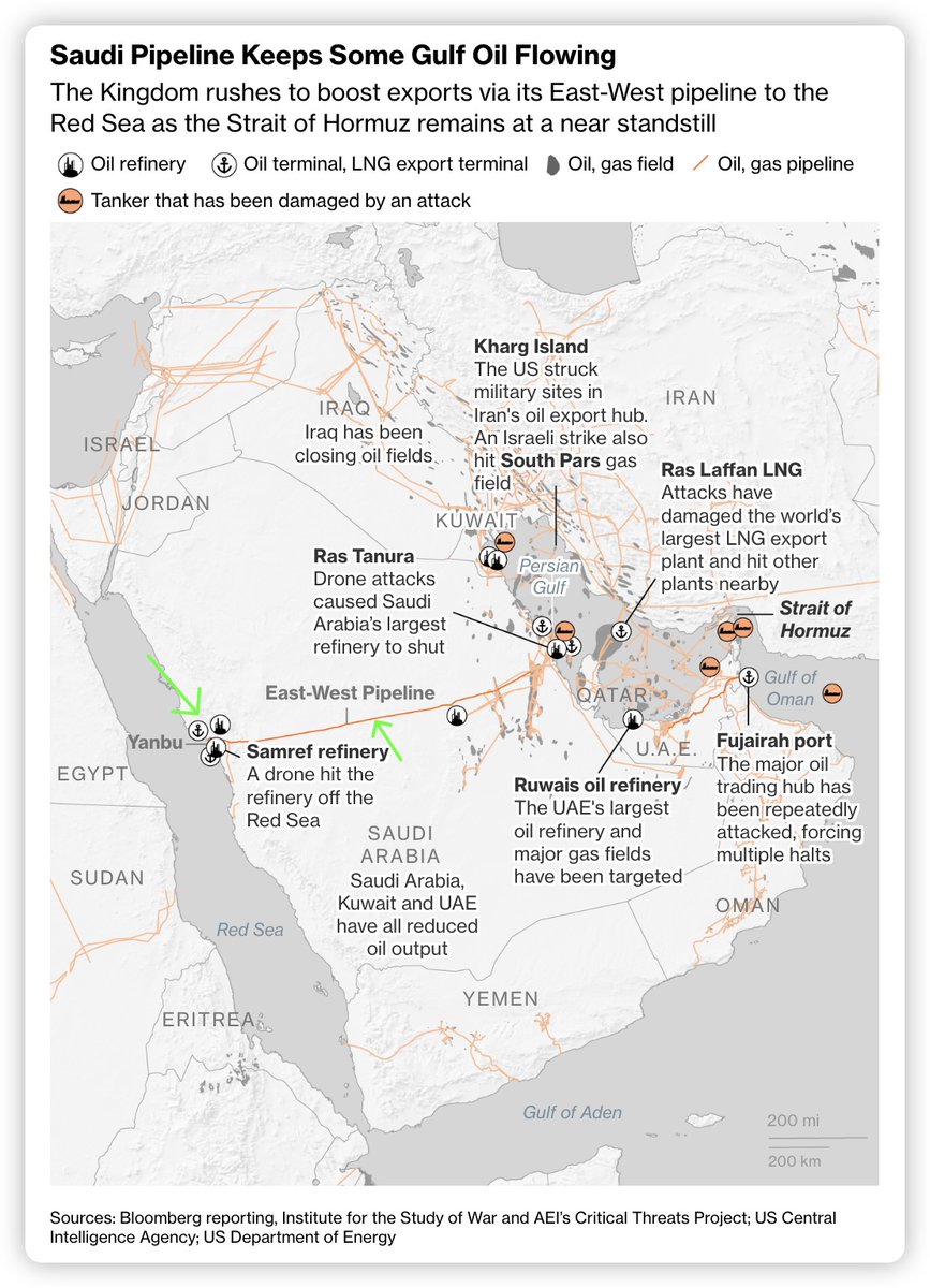沙特阿拉伯绕行霍尔木兹海峡的由东通向西的输油管道正在以每日 700 万桶的满负荷运力输送石油。大批油轮已改道至红海延布港装载石油,为全球供应提供了重要生命线。