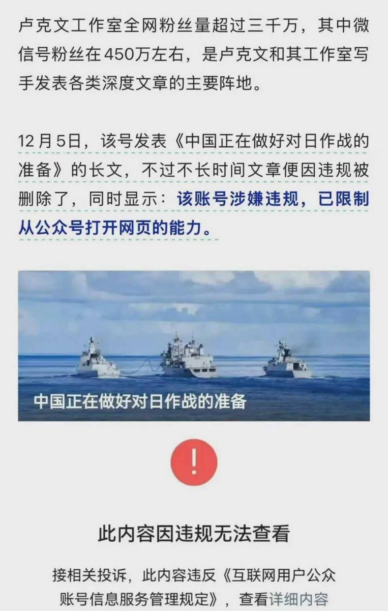 3个月前,高市早苗一句“台湾有事就是日本有事”引发中日外交纠纷。著名正能量博主卢克文妄猜圣意,写了一篇题为《中国正在做好对日作战的准备》随后文章被删,公众号被封禁。