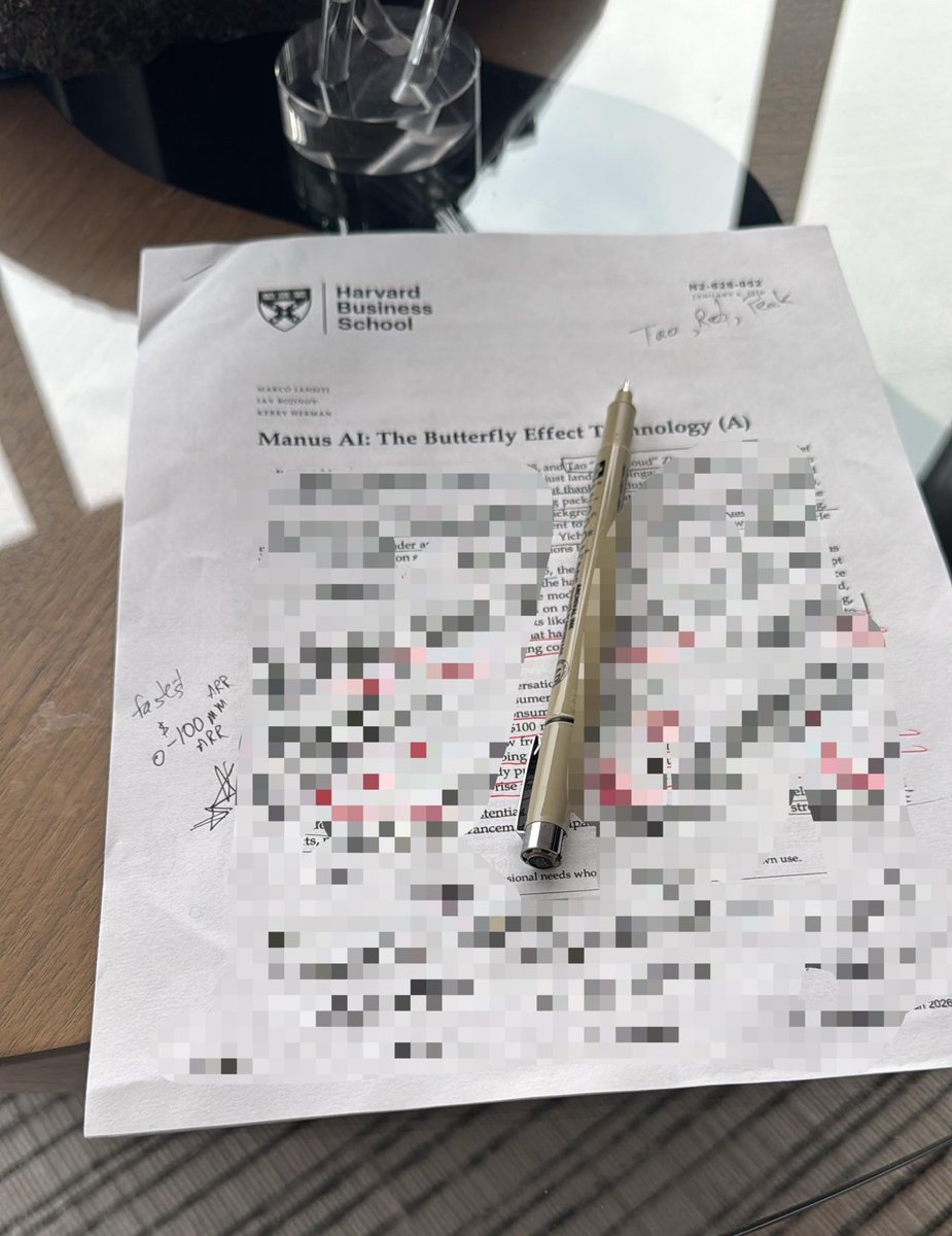 Today marks the first class at Harvard Business School where the Manus case was taught. Huge thanks to Professor Marco and his team for all the effort they put into writing this case over the past year. Photo 3 is from almost exactly this time last year, when I first met and