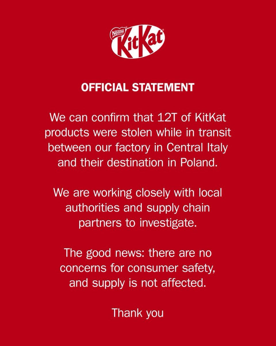 KitKat spokesperson says, 'We've always encouraged people to have a break with KITKAT - but it seems thieves have taken the message too literally and made a break with more than 12 tonnes of our chocolate. Whilst we appreciate the criminals' exceptional taste, the fact remains