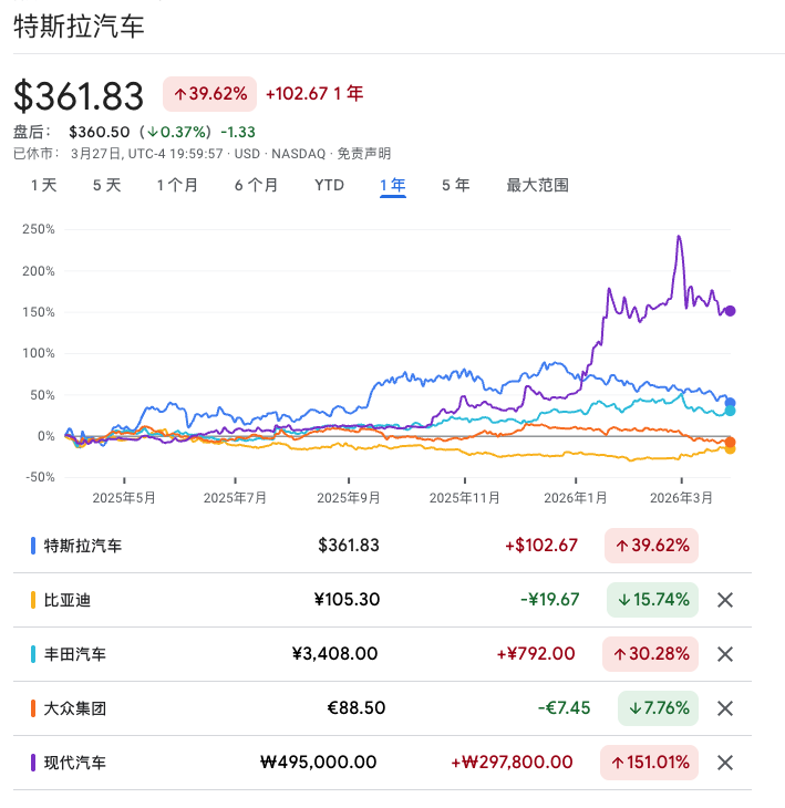 近一年主要汽车品牌股价走势