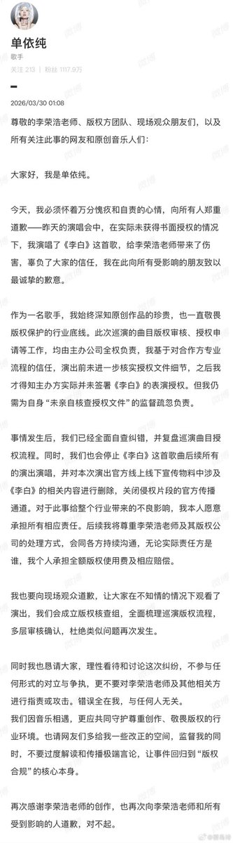 #单依纯承诺承担全额版权使用费及赔偿