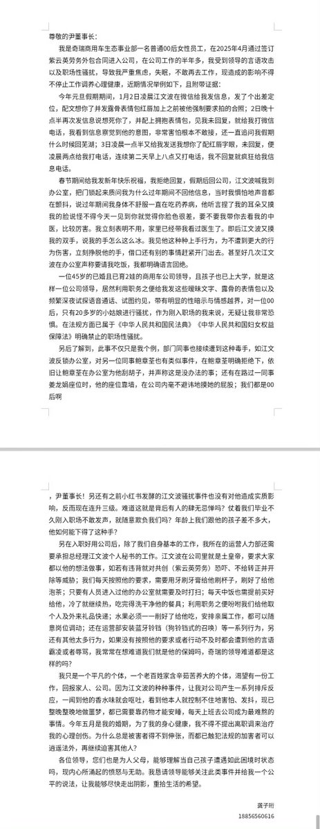 3月31日,自称是奇瑞商用车生态事业部的女员工龚女士发长文举报,称去年4月入职后,遭到奇瑞公司高管江文波职场性骚扰。
