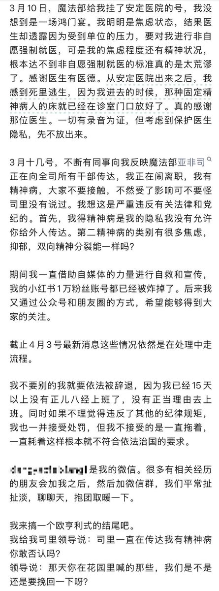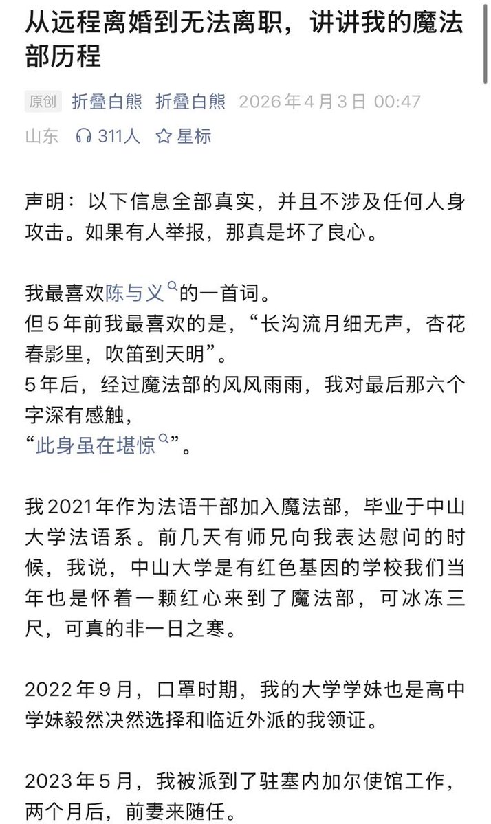 4月3日,一片公众号的文章《从远程离婚到无法离职,讲讲我的魔法部历程》诉说了小公务员的不幸。