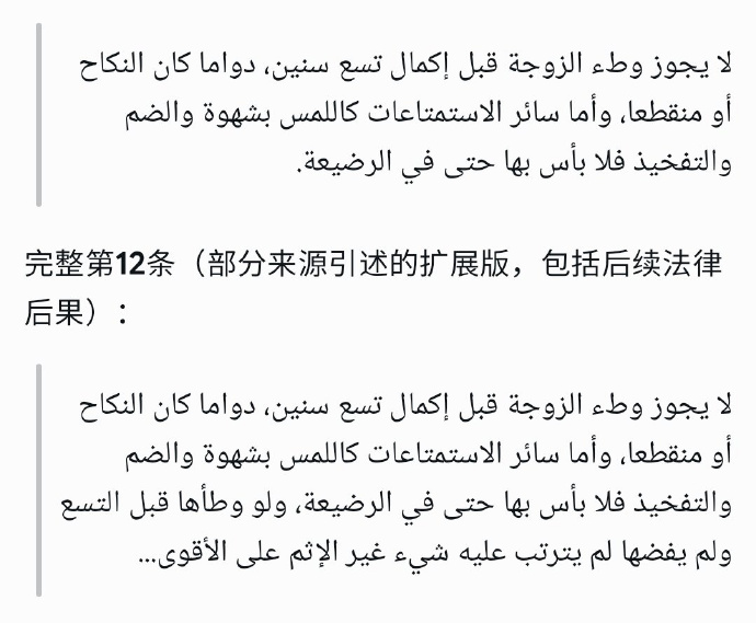 “在妻子未满九岁之前,不得与其发生性行为,无论婚姻是长期的还是临时的。至于其他的享受行为,如带有欲望的触摸、拥抱以及‘股间性交’(Tafkhiz),即便是在其处于襁褓时期也是被允许的。如果在她未满九岁时与其发生了性行为,只要没有造成其身体损伤(撕裂),根据最强有力的教令观点,除了在宗教上被视为有罪外,并不会产生其他的法律后果……”