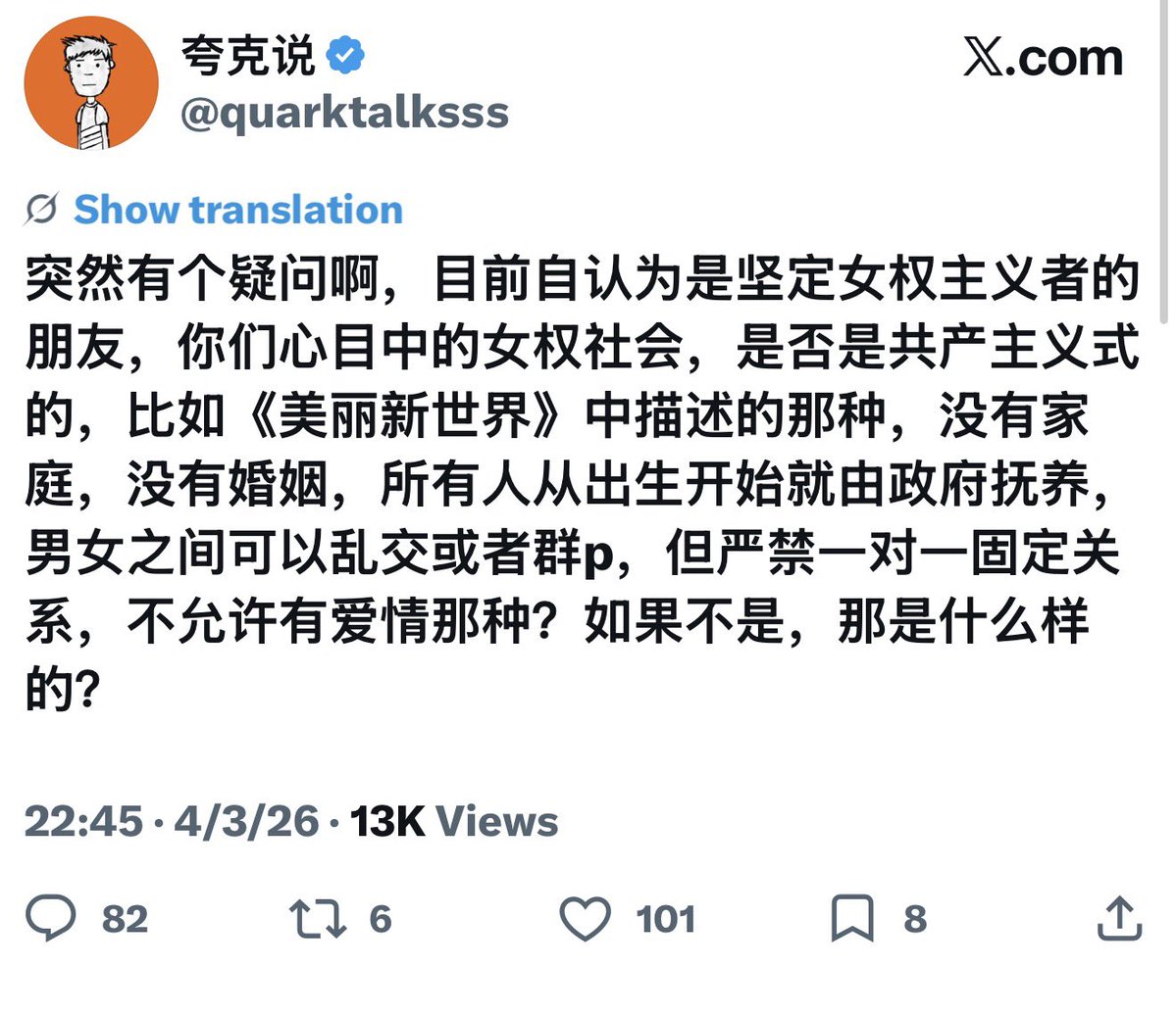 女性朋友们一定要无条件支持女权啊。 因为即便你们仅仅只是想要一个身而为人最最基本的“选择权”,比如: 结不结婚,根据自身情况选择。 也会被这群平时看起来“正气凌然”的男性公知们,自由发挥无限外扩成: 你们争取结婚自由,是因为你们想“滥交”。 所以,还是那句话: 别看他们说什么,看他们做什么。 看他们怎么对待女性、性少数群体、弱者和小动物。