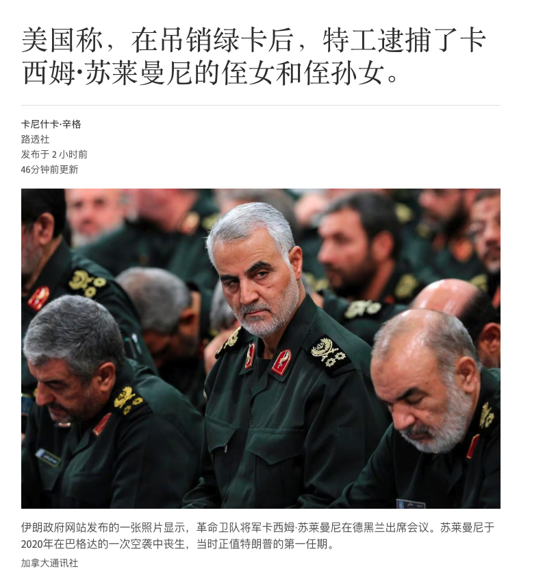 前伊朗伊斯兰革命卫队指挥官,苏莱曼尼侄女和侄孙女的绿卡,并让ICE将两人抓捕驱逐
