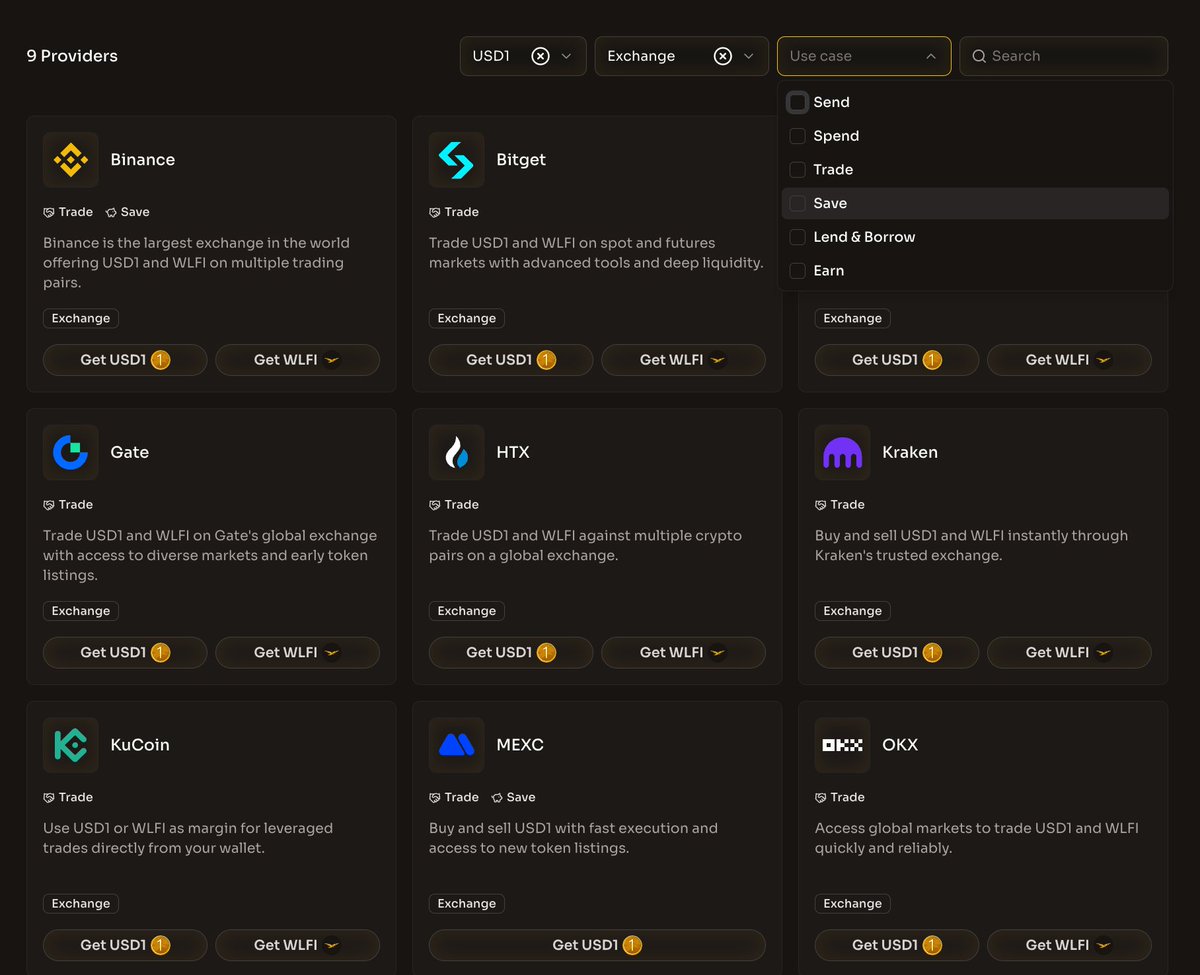 昨天朋友问我 USD1 在哪几个 CEX 有理财活动其实官网往往就有最全的索引 👉 在 USD1 Provider 上筛选「Exchange」,能看到已和 Binance / Bitget / Bybit / Kraken 等 9 个交易所有合作;再进一步筛选「Save」,明确 Binance 和 MEXC 正在搞存款理财活动此外,还和 3