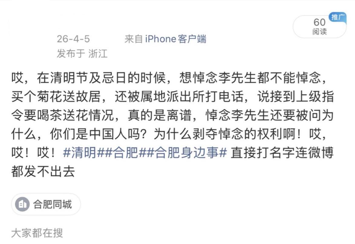 4月5日,有网友表示,今年清明节纪念李克强总理,还是会被警察打电话核查。该信息发出去后,作者账号立马被封禁。