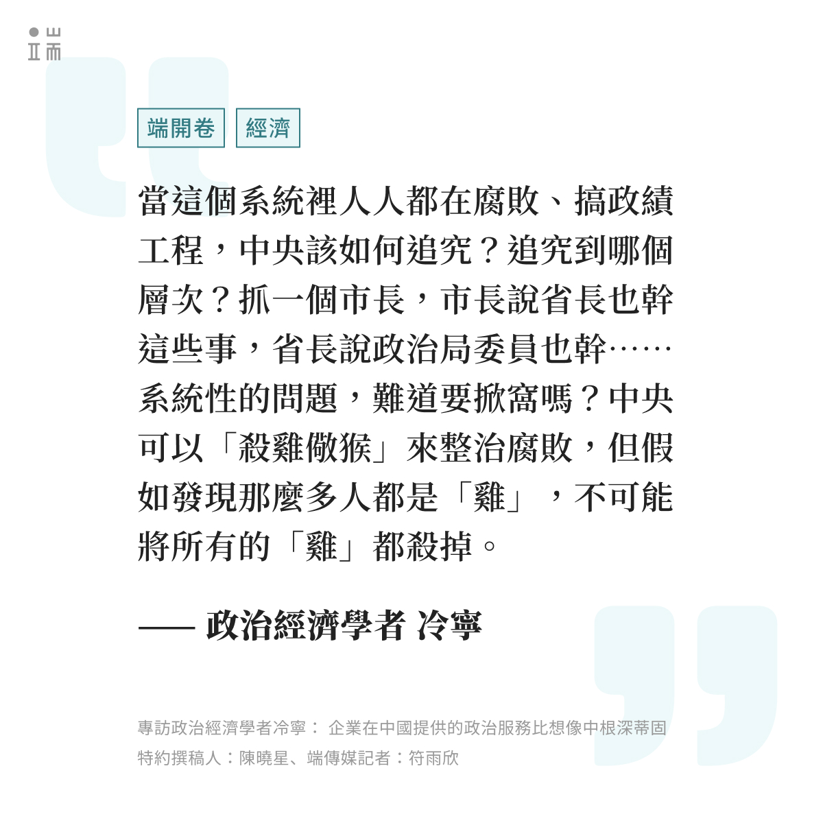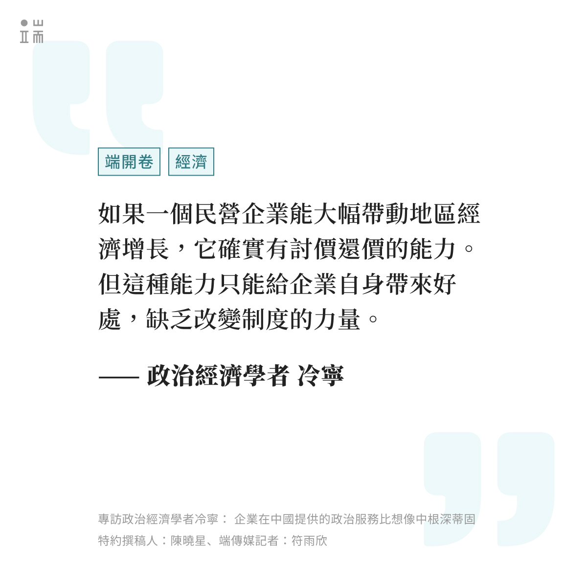 從2015年至2019年,政治經濟學者冷寧輾轉中國15個城市,對公共服務領域的政府官員和企業管理者進行了200多次深度訪談,並於2025年發布著作《Politicizing Business:How Firms Are Made to Serve the Party-State in China》,揭示了中國企業如何參與國家與政府事務,並提供政治服務。有的企業通過參與「看的見、記的住」的 #政績工程 來支持官員的職業發展。有的企業參與 #社會控制 ,幫助政府應對群眾抗議,甚至在某些時候成為「替罪羊」。