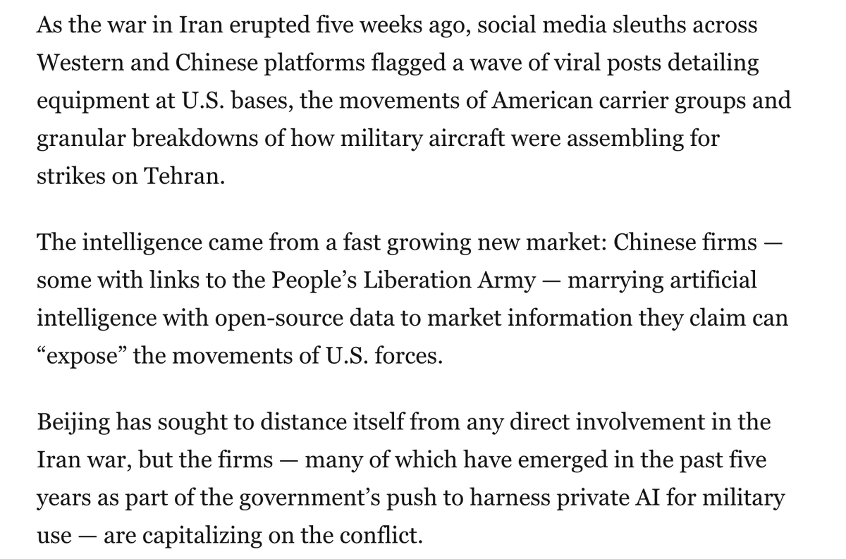 No big deal, just Chinese firms with links to the People's Liberation Army selling data they claim can "expose" the movement of U.S. forces in Iran.