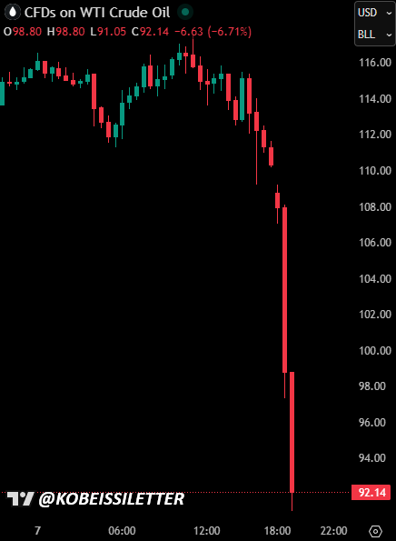 BREAKING: US oil prices crash -23% from their high of the day as Iran, Israel, and the US agree to a ceasefire for two weeks.
