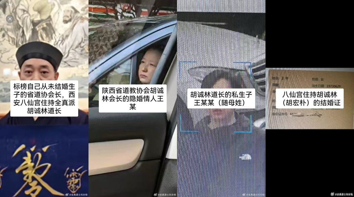 4月7日,全真道士刘永恒发文举报称,陕西省道教协会会长胡诚林对外宣称独身、清修,实际上隐婚生子二十几年,并有多名情人。他还违规给一名97年情人办理了道士证,并一同赴香港游玩。刘永恒还称,胡诚林用庙产给自己买了辆路虎。