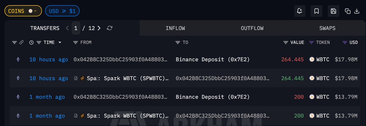 地址 0x042…Fff6a 10 小时前向 #Binance 充值 264.445 枚 $WBTC ,价值 1798 万美元该地址的 WBTC 建仓最早可追溯到 2022 年,由地址 0x051…80b27 转移而来,当时 BTC 提出均价仅 $46808;而上个月他也曾向交易所充值价值 1379 万美元的 WBTC,当前地址的 WBTC 已清仓钱包地址