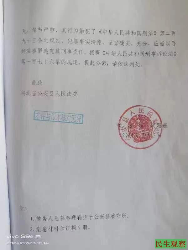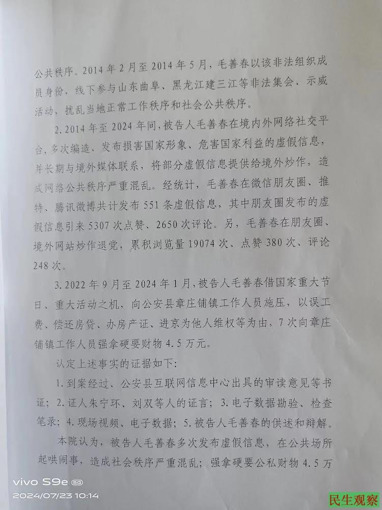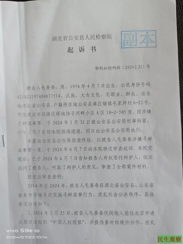起诉书显示,毛善春被指控犯寻衅滋事罪,警方追溯至其2014年尝试注册“中国人权观察”公益组织与线下集会的经历,及过往十年间发布的社交媒体内容。