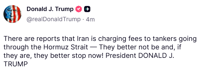 BREAKING: Trump says Iran 'better stop' charging fees to tankers