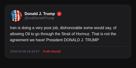 川普刚刚发帖:“伊朗在霍尔木兹海峡的石油通行问题上做得非常差劲,有人甚至说这是不光彩的行为。这根本不是我们达成的协议!总统 唐纳德·J·川普”