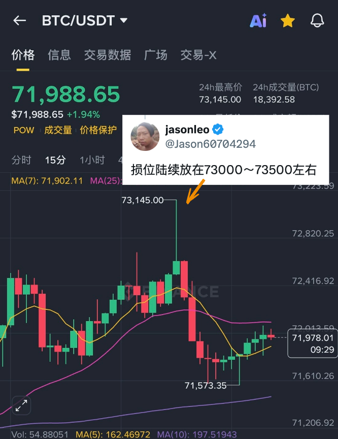 BTC 空单止损区间 $73000~73500,今早拉到 $73145,不知道有没有部分触发「先定 10 个大目标」老哥 @Jason60704294 的止损🧐 ▶︎ $BTC 空单:2201.507 枚,开仓价 $71671.5,浮亏 65 万美元 ▶︎ $ETH 空单:7093 枚,开仓价 $2251.23,浮赢 41.3 万美元 若未止损,老哥总价值 1.73 亿美元的空单累计浮亏约 23.7 万美元,相对他的仓位也就是平平过了