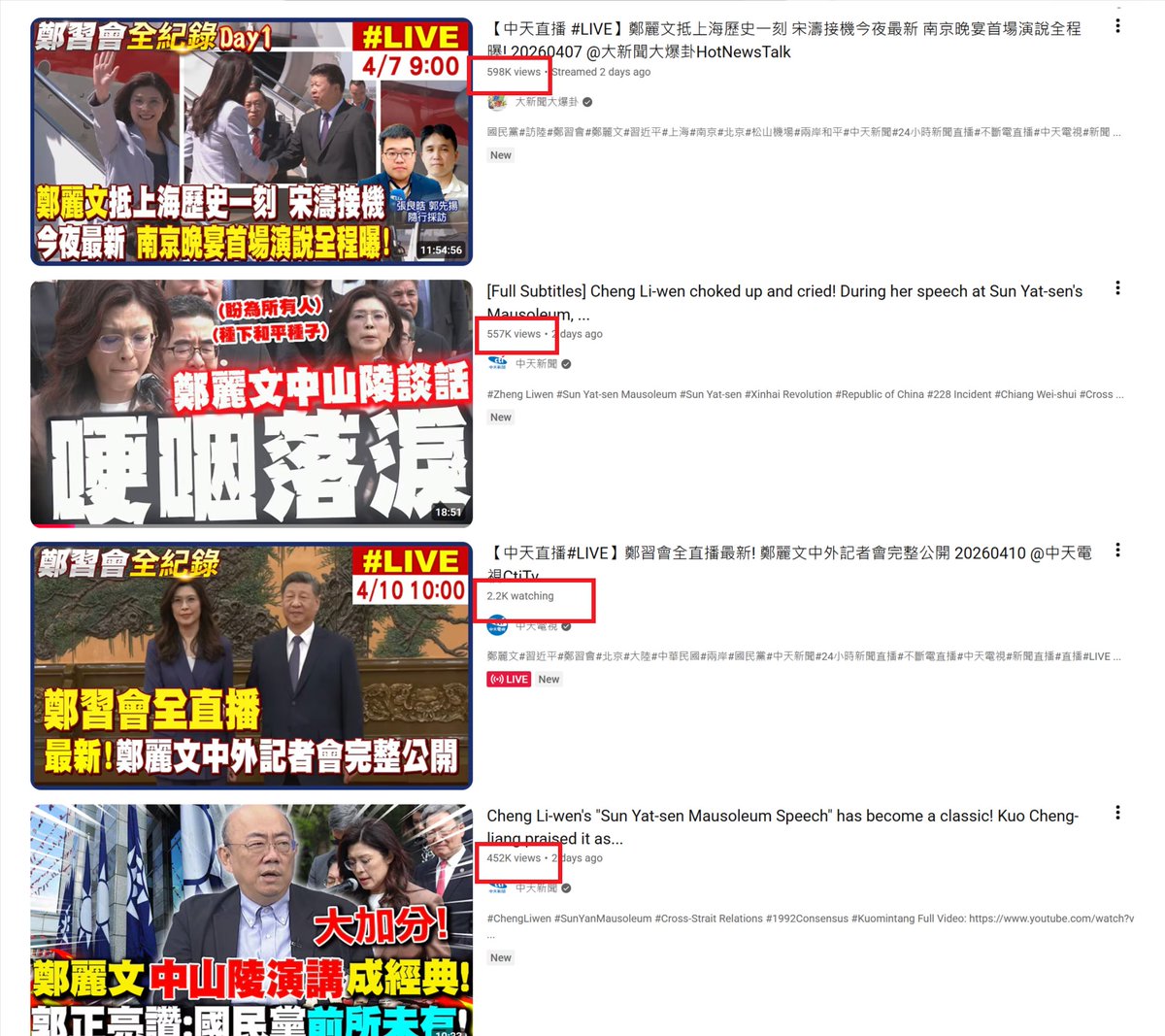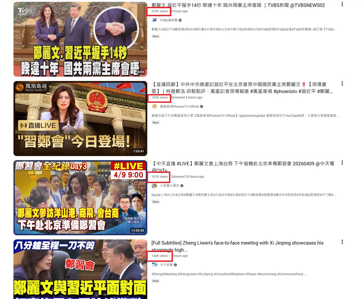 After Xi Jinping meeting, we now clearly see Cheng Li-Wun's China trip is a massive flop in terms of Taiwan public interest. 500k~ views on Youtube like CTI news yesterday, sub-250k~ with Xi today. Far from challenging DPP, Cheng exposed her lack of appeal and messaging failure.