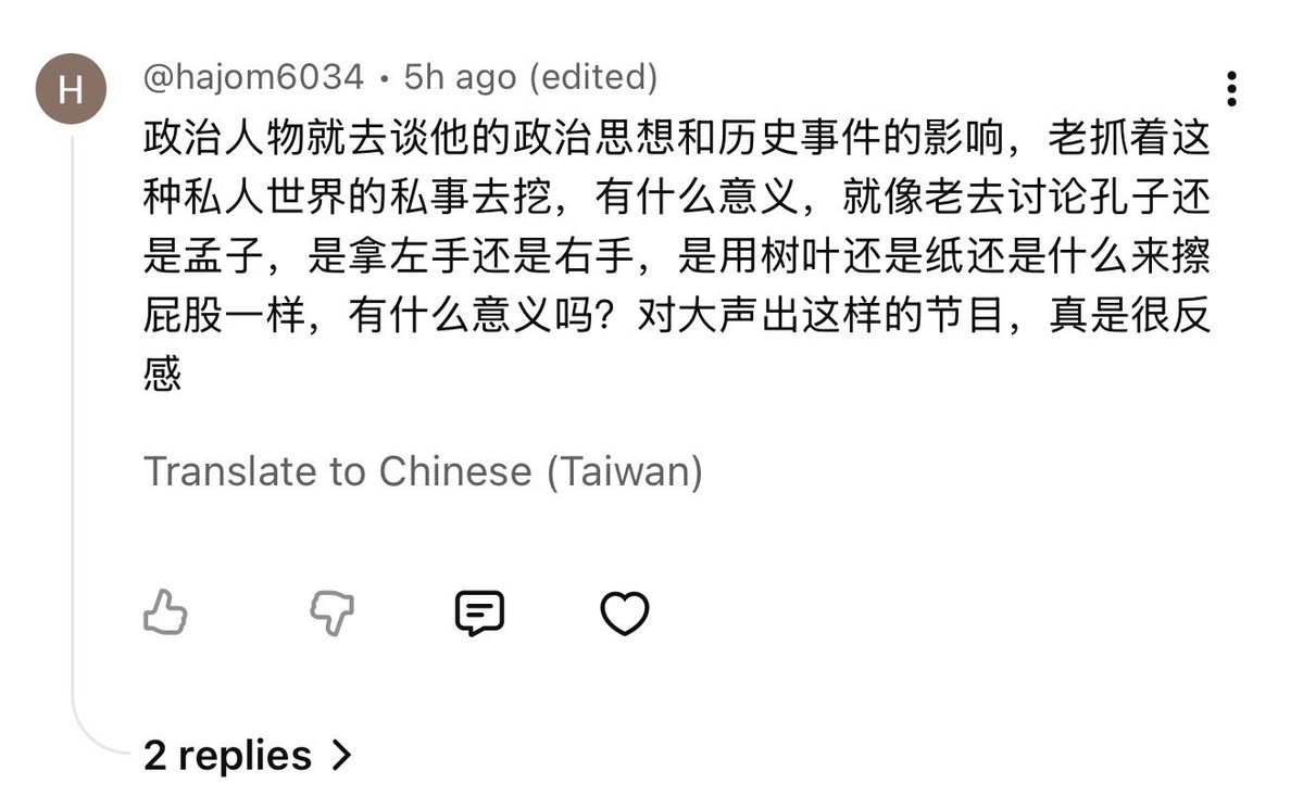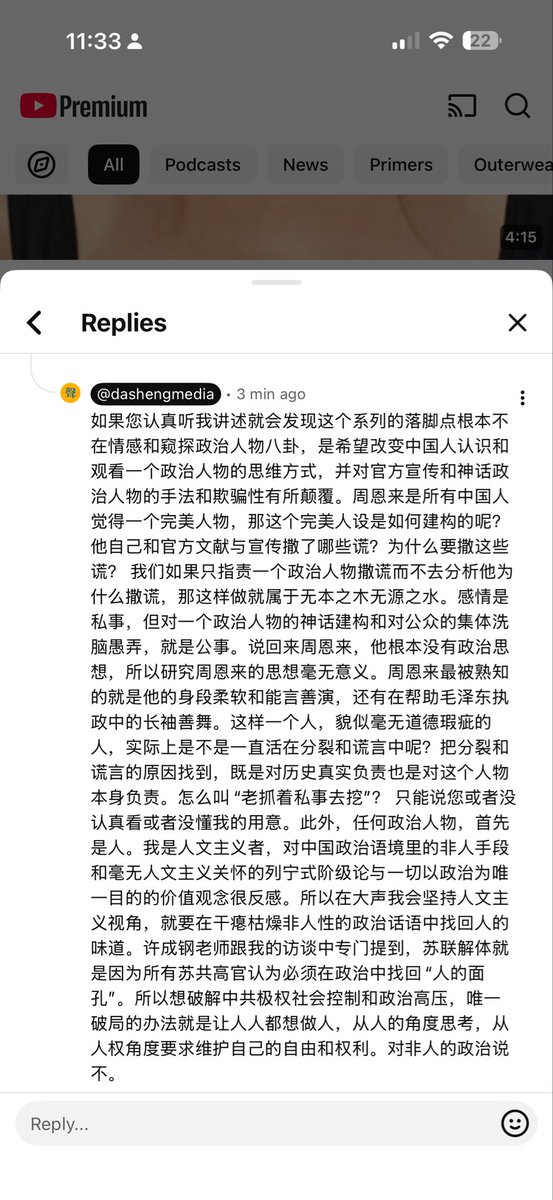 “如果您认真听我讲述就会发现这个系列的落脚点根本不在情感和窥探政治人物八卦,是希望改变中国人认识和观看一个政治人物的思维方式,并对官方宣传和神话政治人物的手法和欺骗性有所颠覆。周恩来是所有中国人觉得一个完美人物,那这个完美人设是如何建构的呢? 他自己和官方文献与宣传撒了哪些谎?为什么要撒这些谎? 我们如果只指责一个政治人物撒谎而不去分析他为什么撒谎,那这样做就属于无本之木无源之水。感情是私事,但对一个政治人物的神话建构和对公众的集体洗脑愚弄,就是公事。说回来周恩来,他根本没有政治思想,所以研究周恩来的思想毫无意义。周恩来最被熟知的就是他的身段柔软和能言善演,还有在帮助毛泽东执政中的长袖善舞。这样一个人,貌似毫无道德瑕疵的人,实际上是不是一直活在分裂和谎言中呢?把分裂和谎言的原因找到,既是对历史真实负责也是对这个人物本身负责。怎么叫“老抓着私事去挖”? 只能说您或者没认真看或者没懂我的用意。此外,任何政治人物,首先是人。我是人文主义者,对中国政治语境里的非人手段和毫无人文主义关怀的列宁式阶级论与一切以政治为唯一目的的价值观念很反感。所以在大声我会坚持人文主义视角,就要在干瘪枯燥非人性的政治话语中找回人的味道。许成钢老师跟我的访谈中专门提到,苏联解体就是因为所有苏共高官认为必须在政治中找回“人的面孔”。所以想破解中共极权社会控制和政治高压,唯一破局的办法就是让人人都想做人,从人的角度思考,从人权角度要求维护自己的自由和权利。对非人的政治说不。”