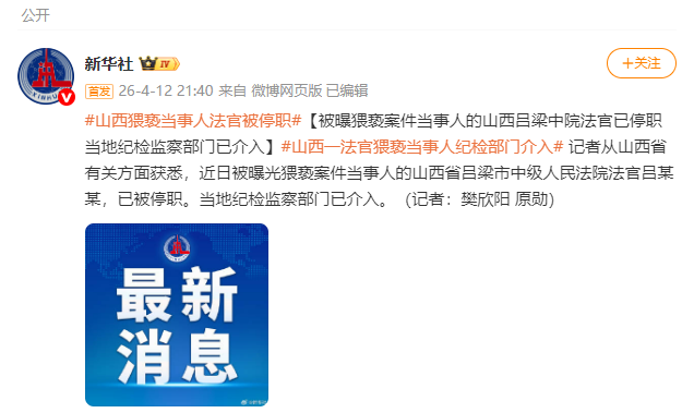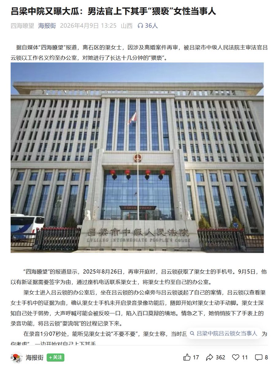 4月9日,山西吕梁市离石区的渠女士,因涉及离婚案件再审,2025年8月26日被吕梁市中级人民法院主审法官吕云锁以工作名义约至办公室,对她进行了长达十几分钟的“猥亵”。