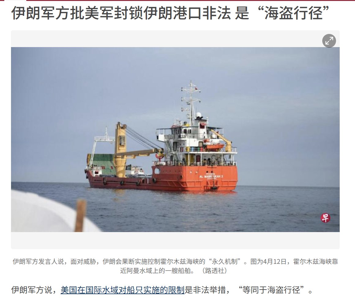 对此,伊朗军方称,美国在国际水域对船只实施的限制是非法举措,“等同于海盗行径”。