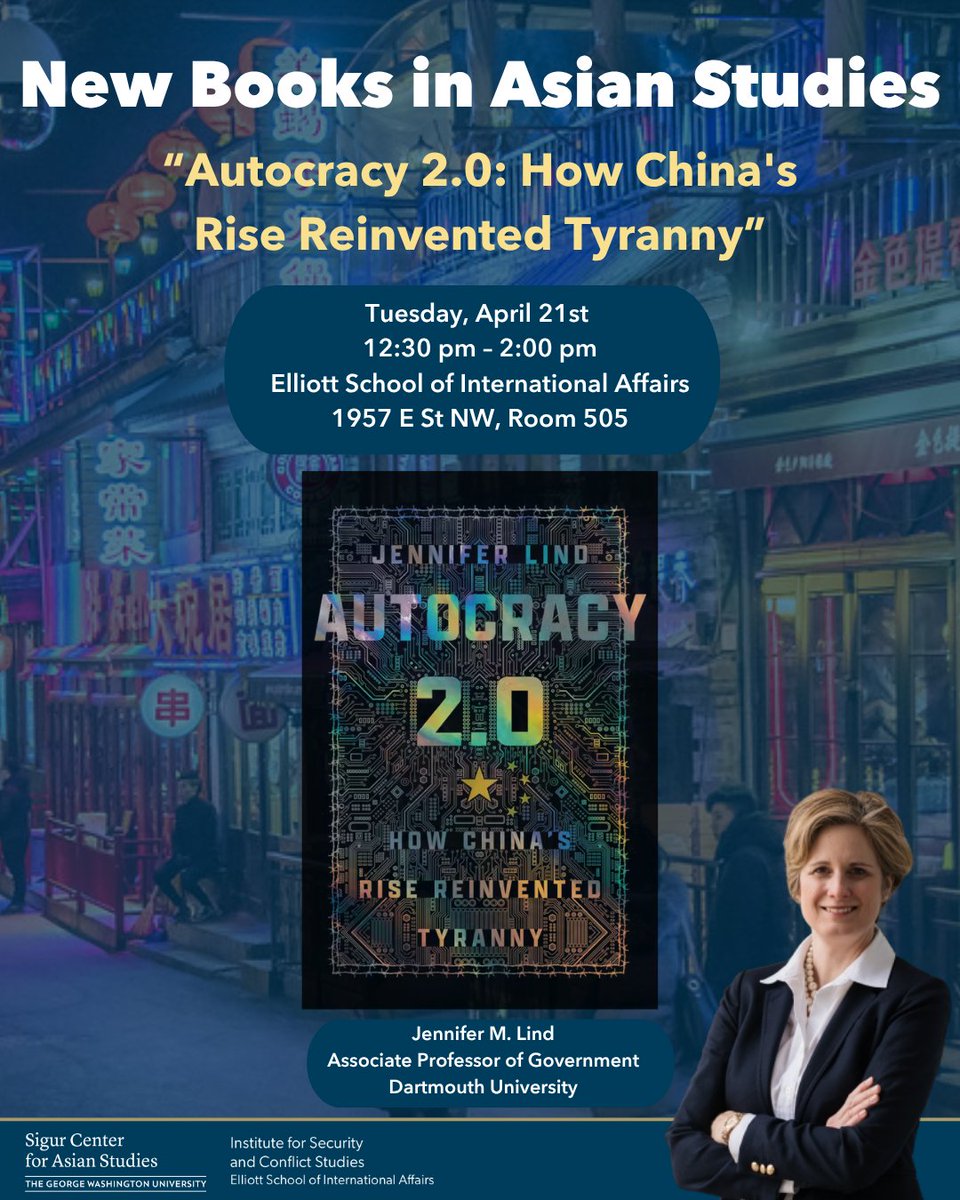 Join the Sigur Center on Tuesday, April 21st to discuss Professor Lind's new book “Autocracy 2.0: How China's Rise Reinvented Tyranny,” about how today's autocrats are reshaping the technological frontier, governance, and the global balance of power. RSVP at the link in our bio.