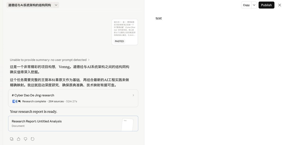亲历 Claude 降智现场,这也太离谱了,研究 52 分钟给我输出了一个词:test。