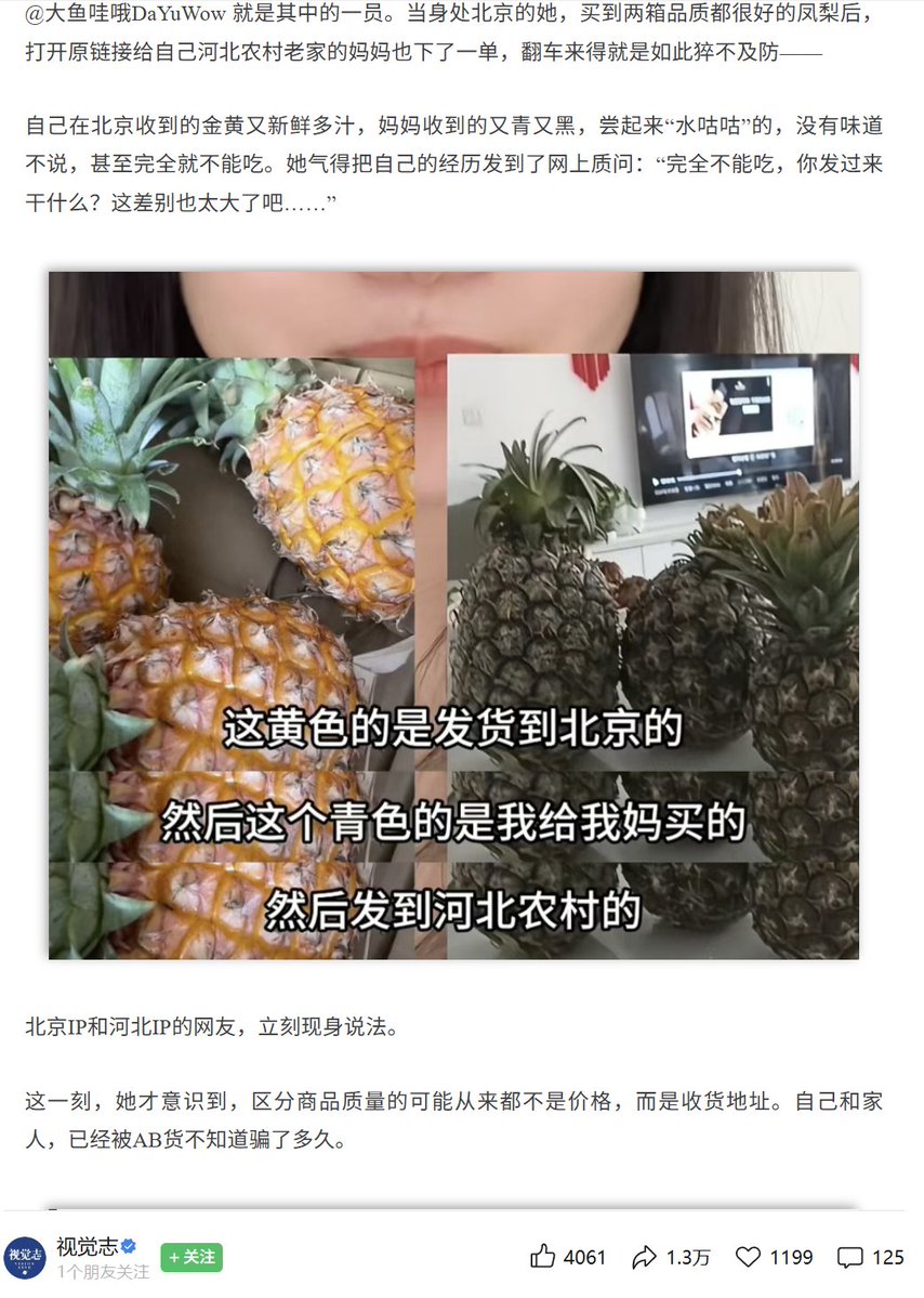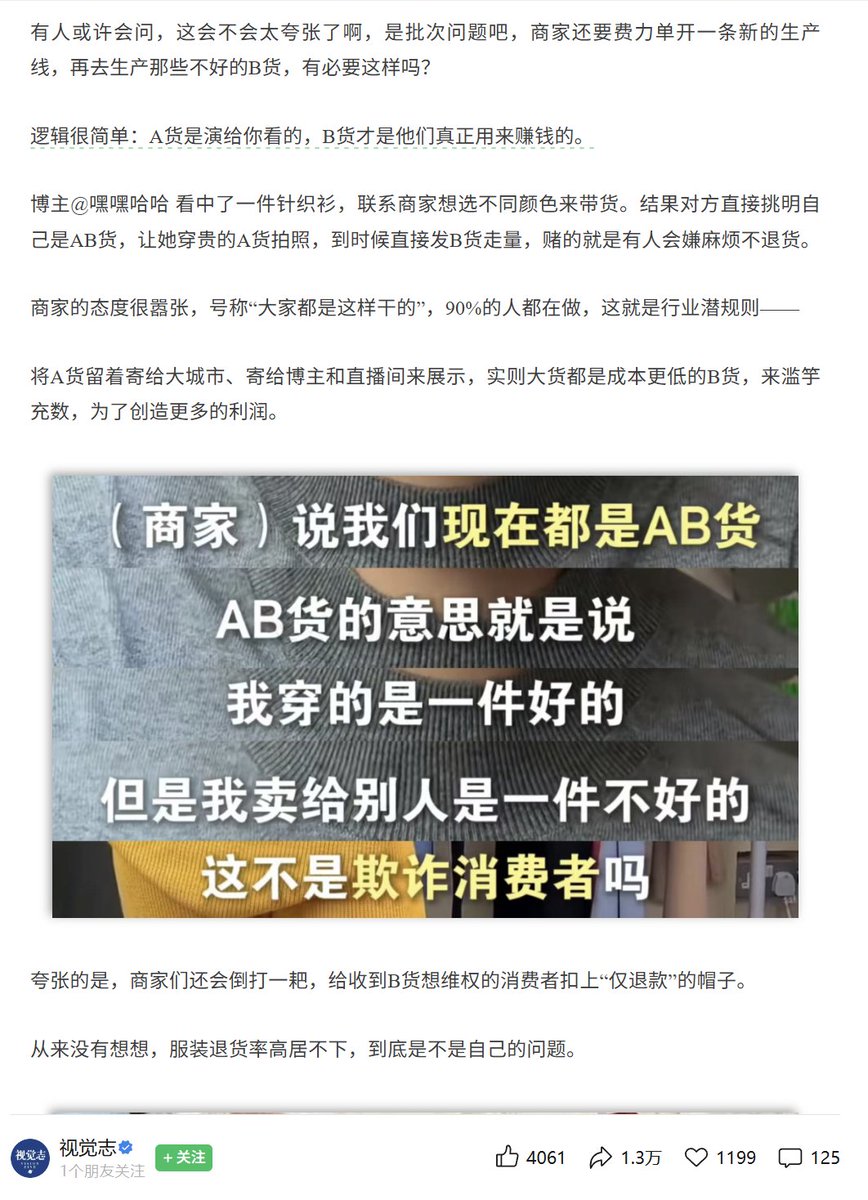 4月15日。,媒体《视觉志》报道了县城农村AB货泛滥的现象,电商平台的商家们给北上广深等一线大城市发质量更好的A货,专门给县城农村发质量不合格的B货。