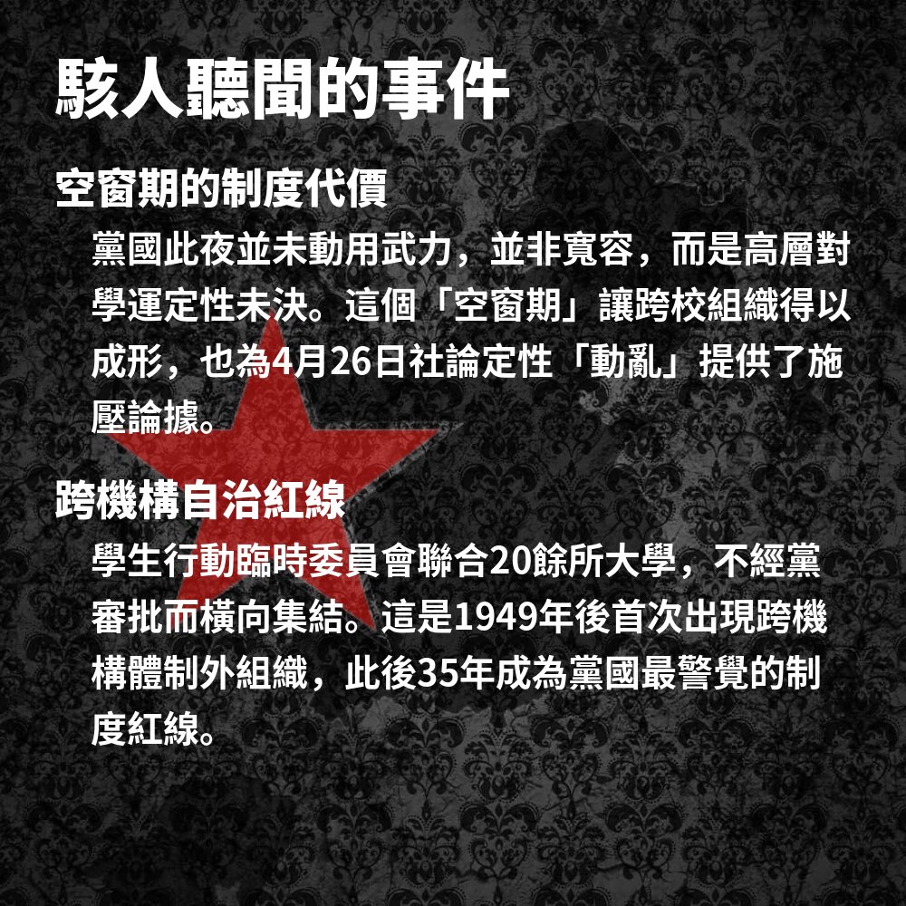 1989年4月21日,37年前的今天晚上8点,北京20余所高校约4万名学生违抗北京市公安局当日发布的广场管制公告,连夜游行进入天安门广场,为次日胡耀邦追悼会守灵。这一夜,学生行动临时委员会成立,学运从悼念正式转为政治请愿;党国对跨机构自治组织的零容忍底色,也就此被写入之后三十年的治理逻辑。 #极权中国史历史上的今天