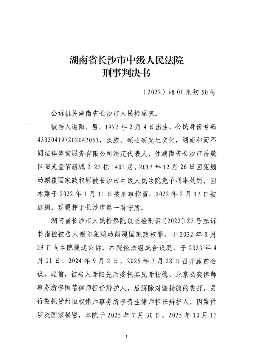 【发推文与接受外媒采访获刑5年:人权律师谢阳因言获罪的司法铁证】根据湖南省长沙市中级人民法院的一审刑事判决书,人权律师谢阳被指控犯“煽动颠覆国家政权罪”。