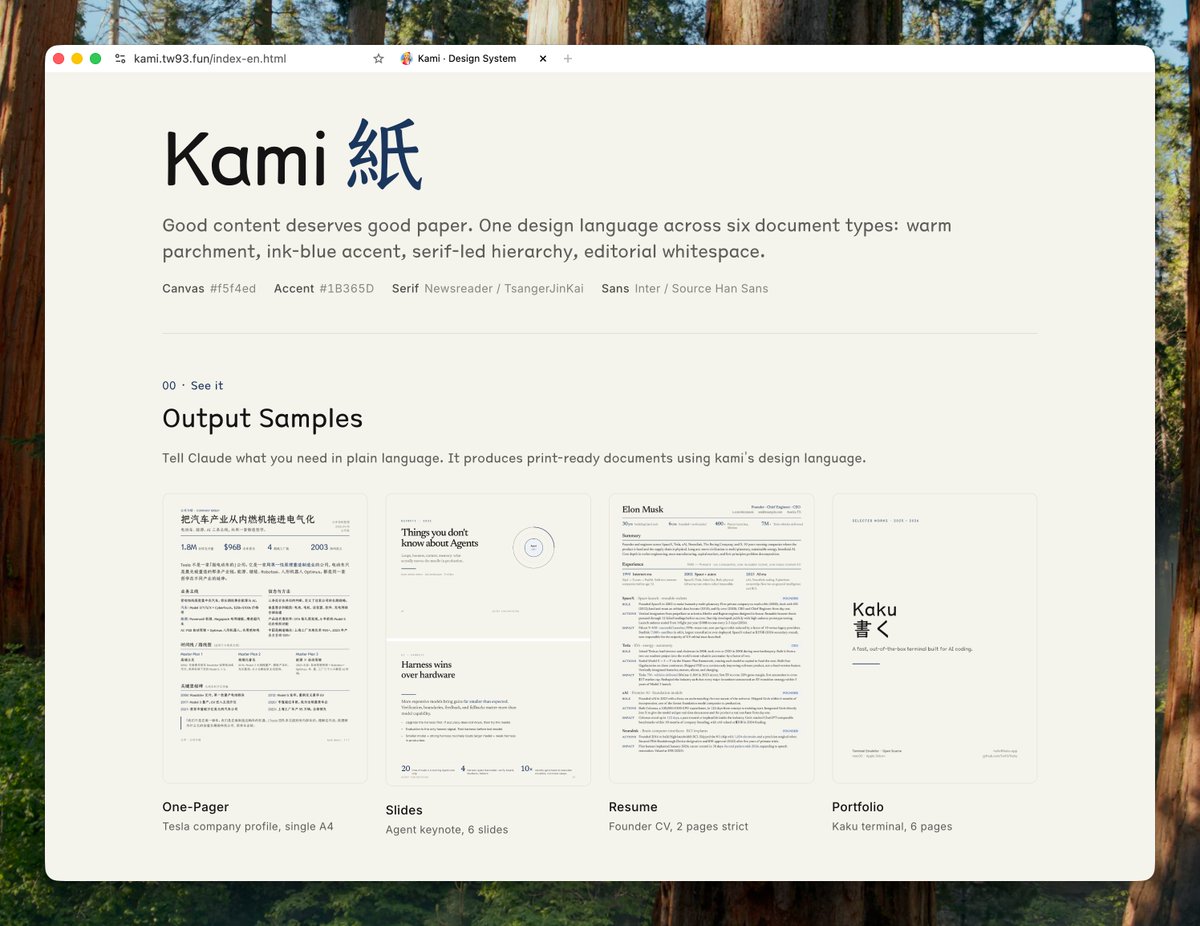 A design system for AI-native docs: one-pagers, resumes, portfolios, letters, long docs, and slides. Bilingual, diagram-ready, print-ready. Zero setup.