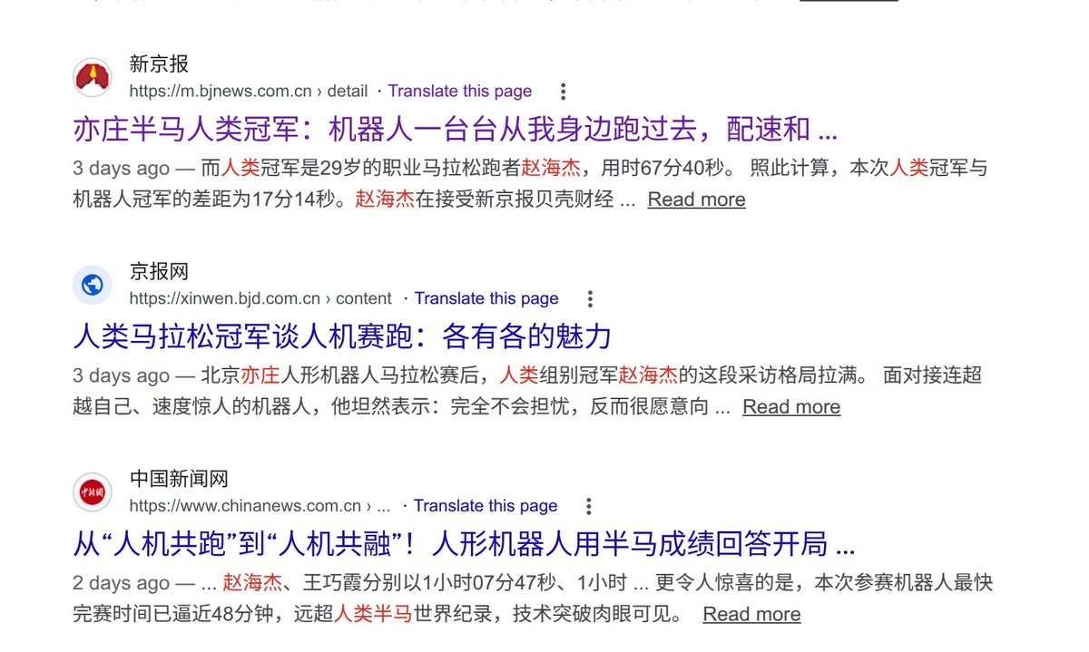 北京亦庄半马这几天连续刷屏了,但我问一下大家,你们知道到底是哪个人类得了这次半马的冠军吗?你不知道,其实,这次人类冠军如果不是答应谈机器人,连登报可能都没没有,而其他人类运动员在这场机器人半马比赛中,只有停下来用手机拍照的份。人从来没有这么没存在感过,太有象征意义了。