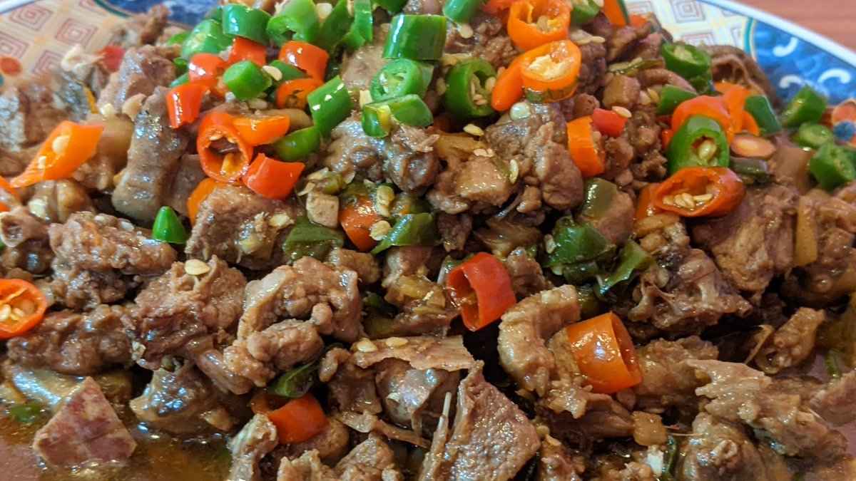变态辣级别的干炒水鸭(野鸭)。鸭子尽量剁碎。配料有泡辣椒青红辣椒及姜,爆香配料后炒至干水下点盐生抽即可。